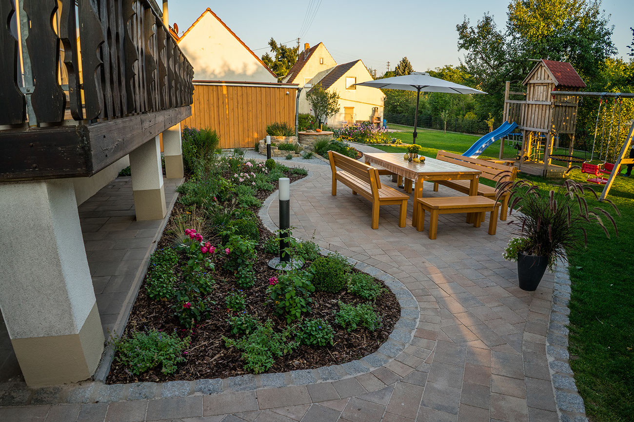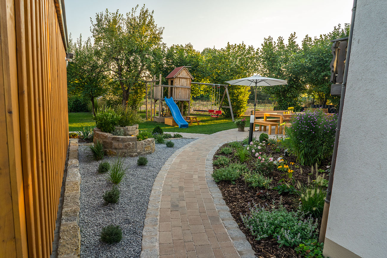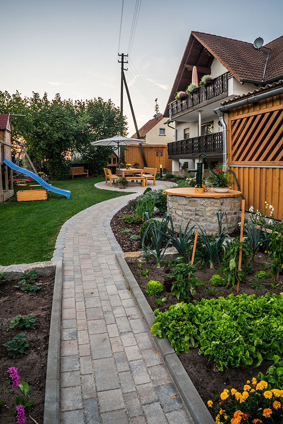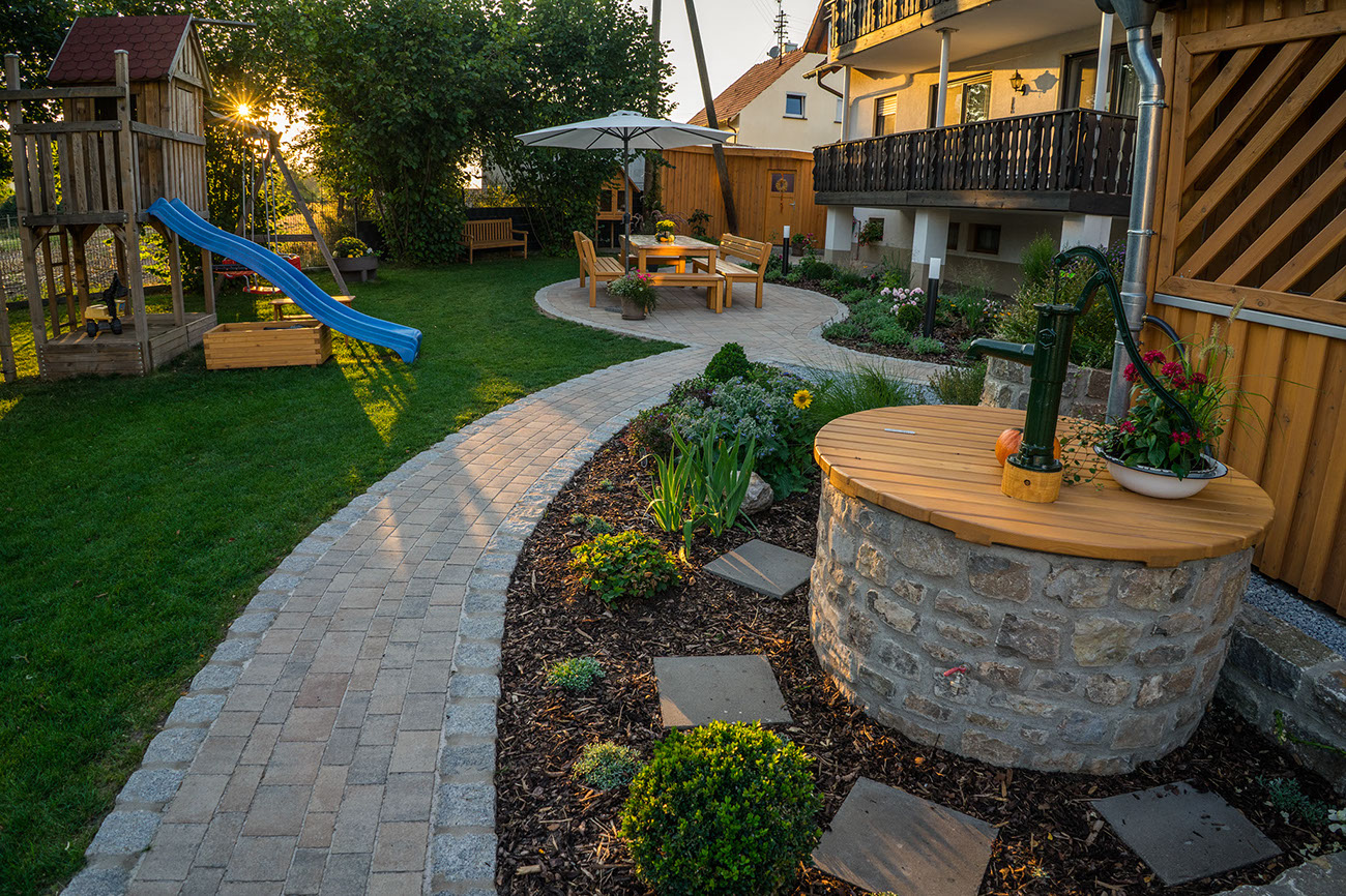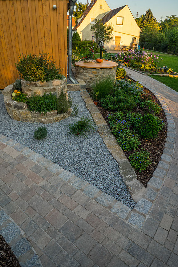 Dieser Garten in Heuchelheim wurde rundum erneuert. Vor Allem der der Straße abgewandte Teil wurde überarbeitet. So fanden neue Beete und Gehwege ebenso Platz, wie eine Kräuterschnecke und ein Brunnen. Die Sitzgruppe ist nun der zentrale Ort des Gartens. Auf Ihr sitzend kann man die Kinder beim spielen beobachten.