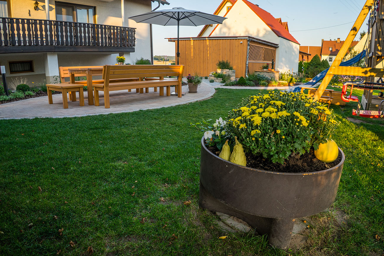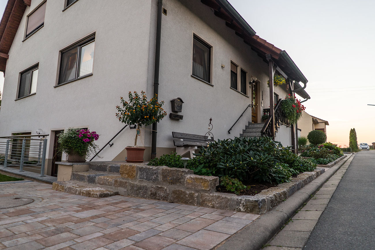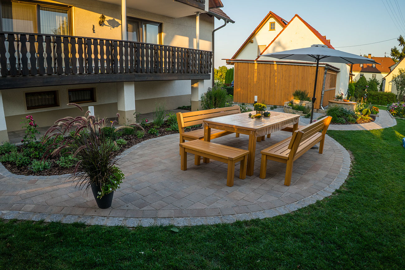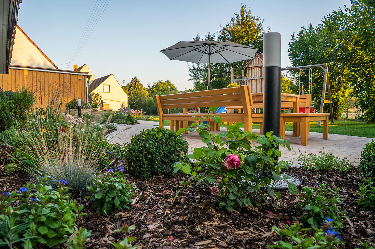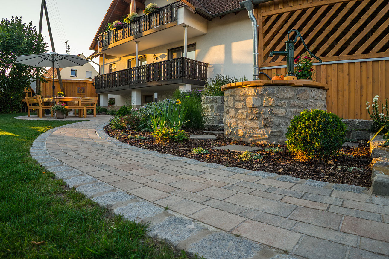 Dieser Garten in Heuchelheim wurde rundum erneuert. Vor Allem der der Straße abgewandte Teil wurde überarbeitet. So fanden neue Beete und Gehwege ebenso Platz, wie eine Kräuterschnecke und ein Brunnen. Die Sitzgruppe ist nun der zentrale Ort des Gartens. Auf Ihr sitzend kann man die Kinder beim spielen beobachten.