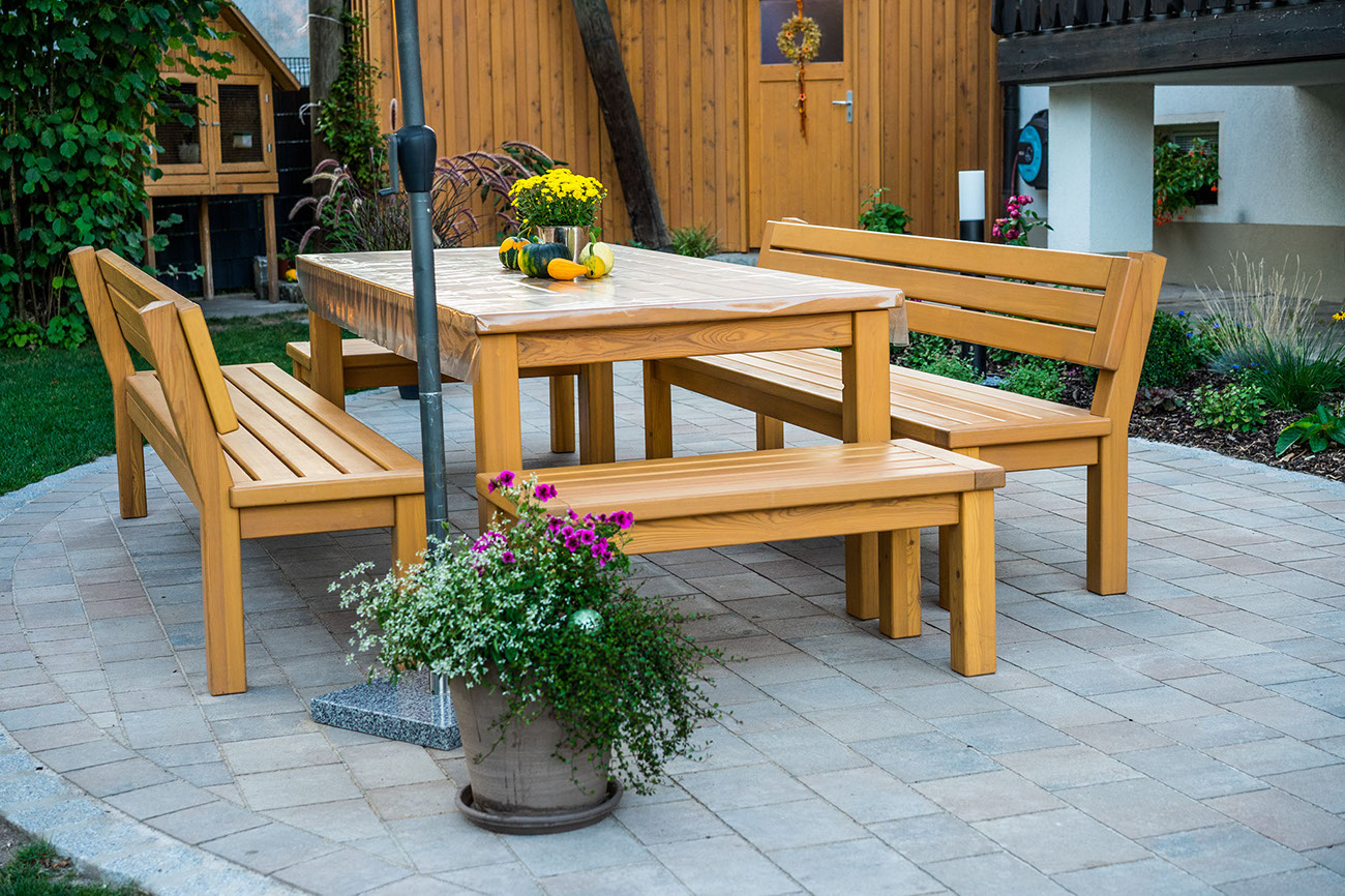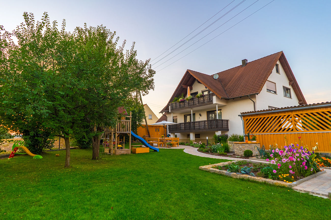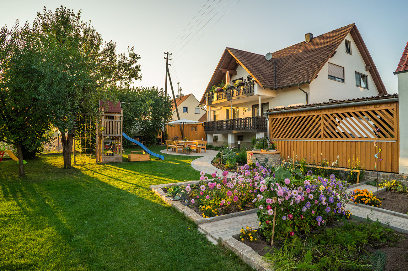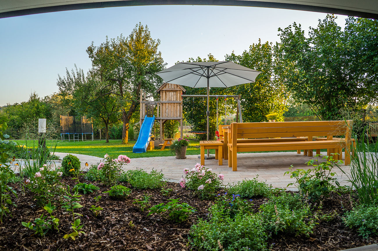 Dieser Garten in Heuchelheim wurde rundum erneuert. Vor Allem der der Straße abgewandte Teil wurde überarbeitet. So fanden neue Beete und Gehwege ebenso Platz, wie eine Kräuterschnecke und ein Brunnen. Die Sitzgruppe ist nun der zentrale Ort des Gartens. Auf Ihr sitzend kann man die Kinder beim spielen beobachten.