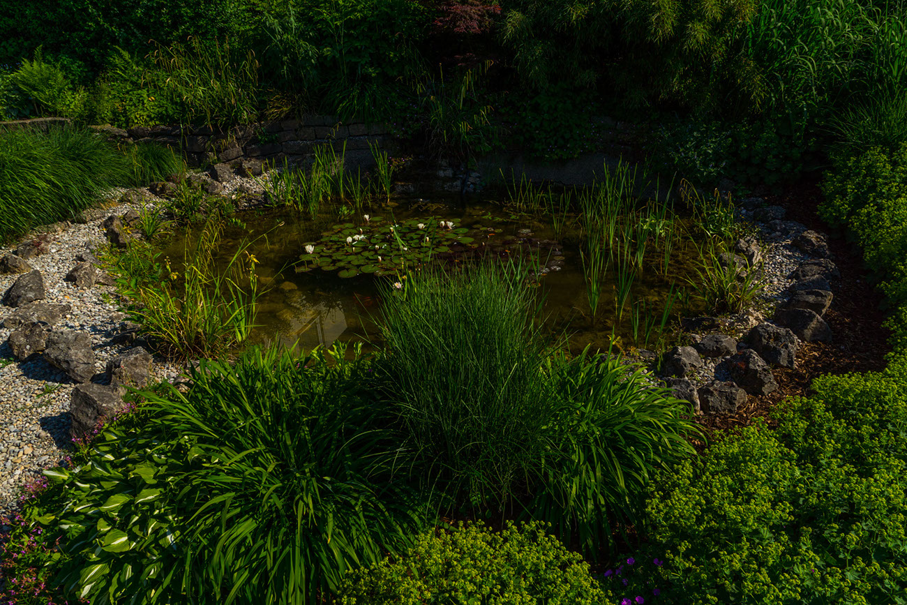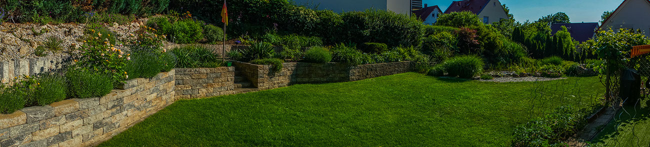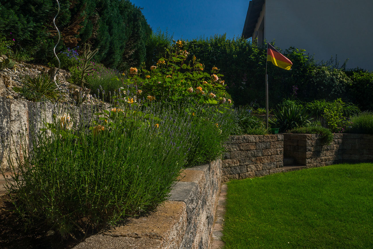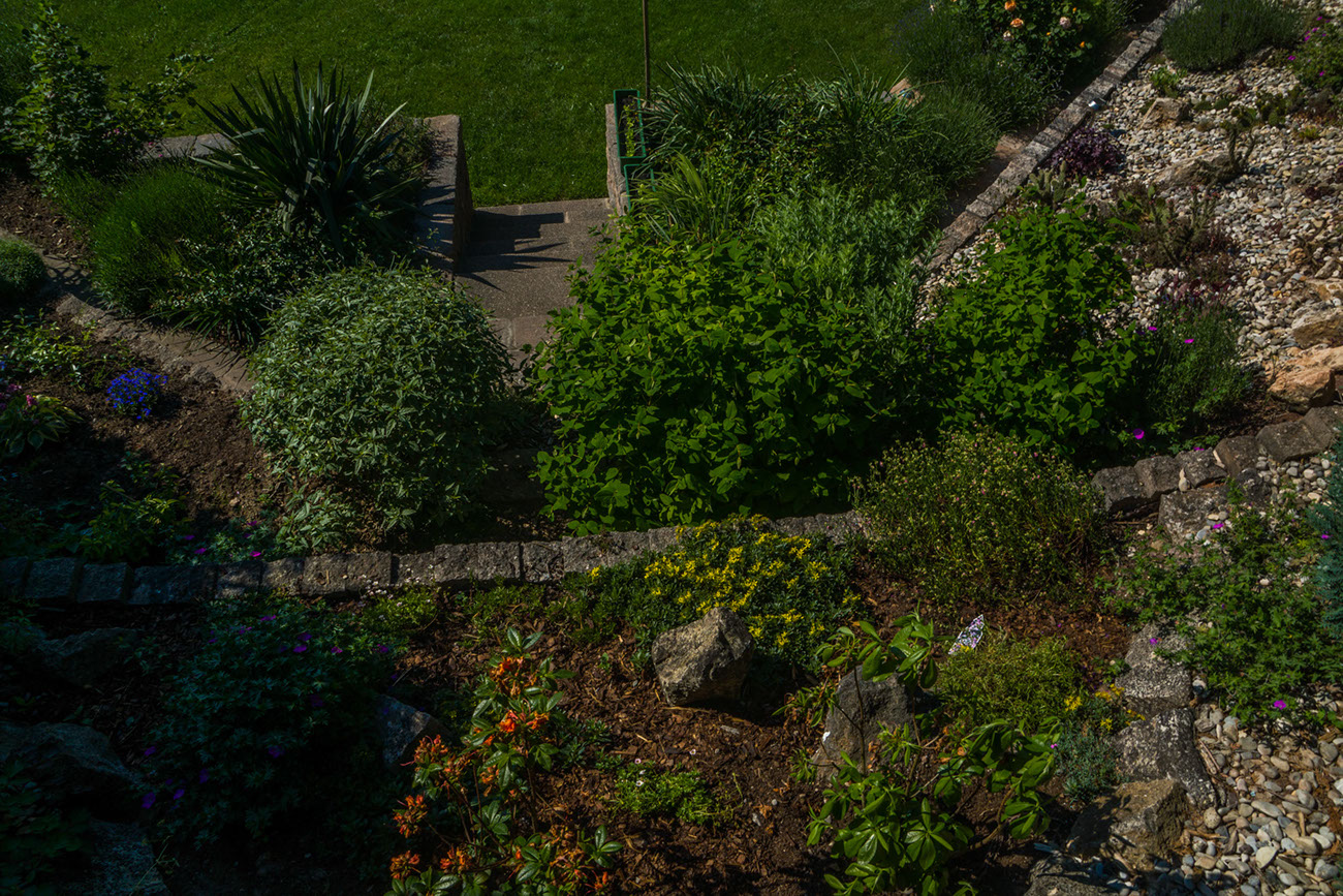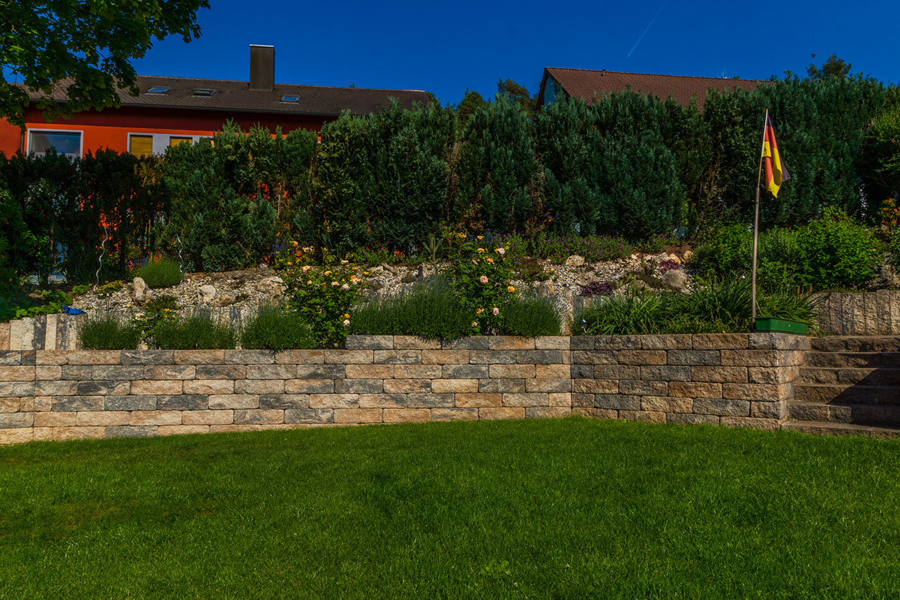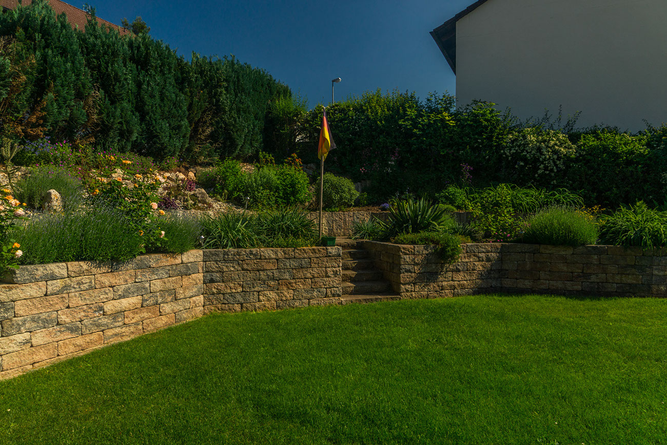 Um die Gartenanlage in Weingartsgreuth zu bestaunen muss man zuerst hinter das Haus gehen. Hier fällt zunächst die abgestufte Steinmauer auf, die den Garten umschließt. Sie beherbergt viele Pflanzenarten von Rosen bis zu winterharten Kakteen. Neben der Mauer liegt ein von Fischen, Kröten und Libellen bewohnter Folienteich. Dieser wird von einem Kiesbereich abgetrennt, der ebenso zu einer Kräuterschnecke führt. Jenseits der Kräuterschnecke wurde der Hang befestigt. Der komplette Garten wird von Sträuchern und Büschen umrahmt.