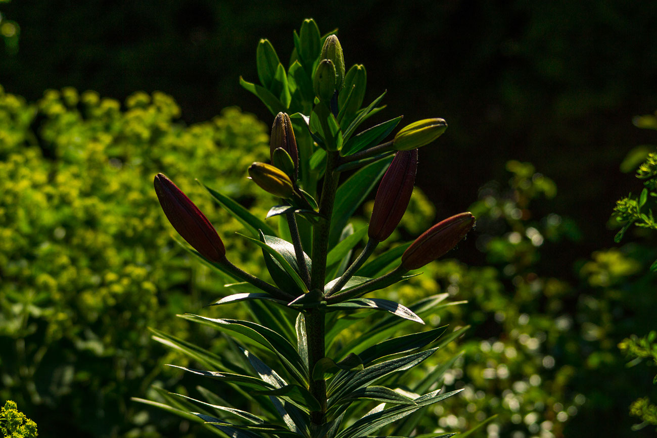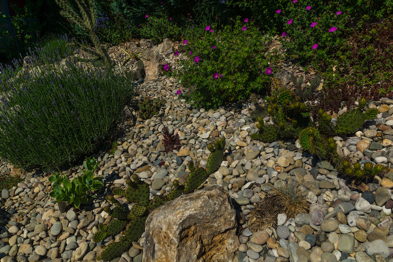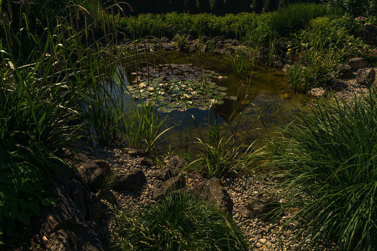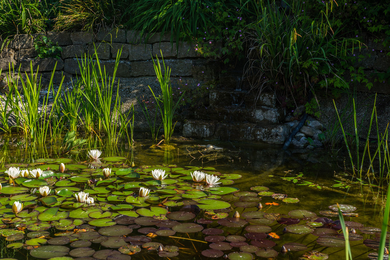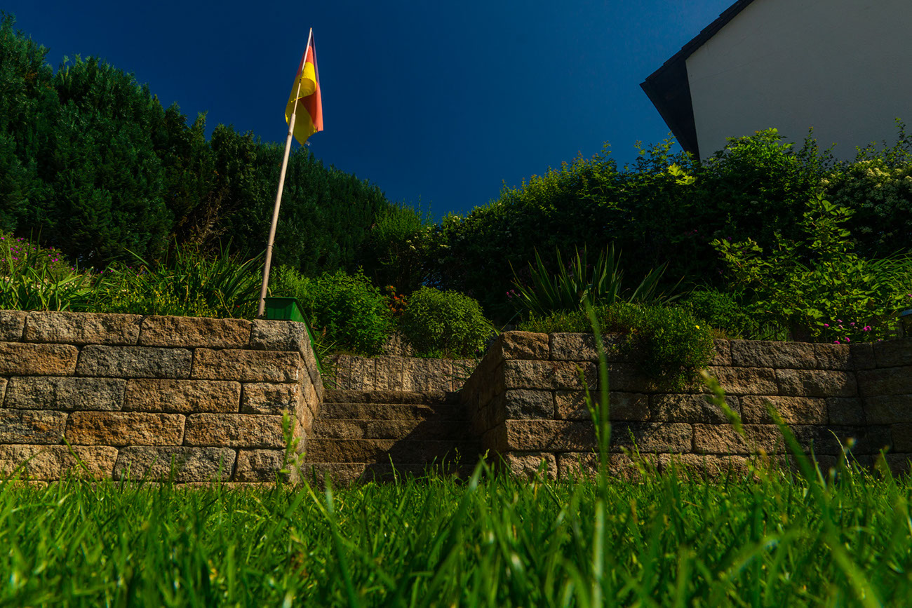 Um die Gartenanlage in Weingartsgreuth zu bestaunen muss man zuerst hinter das Haus gehen. Hier fällt zunächst die abgestufte Steinmauer auf, die den Garten umschließt. Sie beherbergt viele Pflanzenarten von Rosen bis zu winterharten Kakteen. Neben der Mauer liegt ein von Fischen, Kröten und Libellen bewohnter Folienteich. Dieser wird von einem Kiesbereich abgetrennt, der ebenso zu einer Kräuterschnecke führt. Jenseits der Kräuterschnecke wurde der Hang befestigt. Der komplette Garten wird von Sträuchern und Büschen umrahmt.